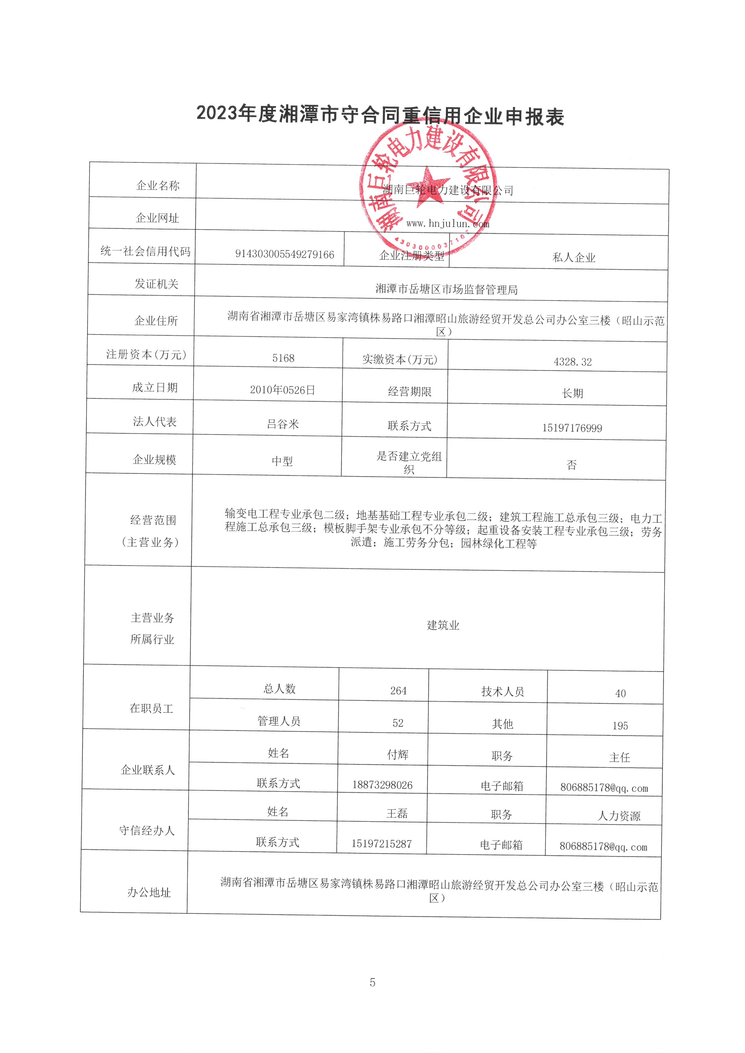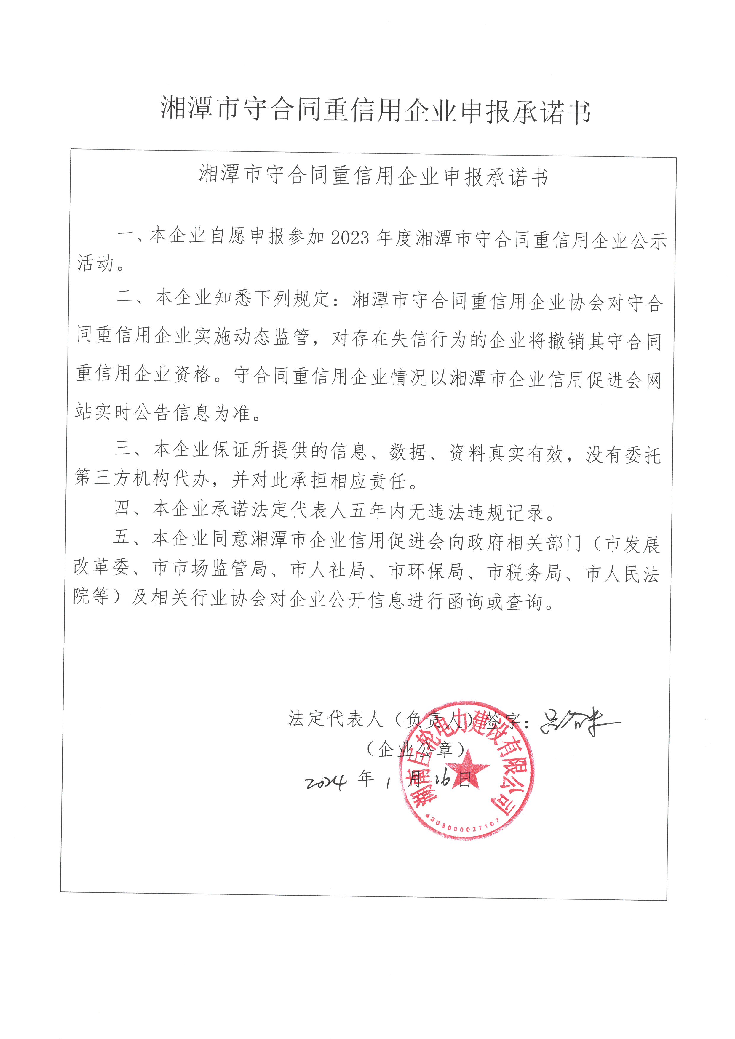 本企業(yè)根據(jù)《湘潭市守合同重信用企業(yè)申報(bào)規(guī)定》等編制 2023 年度企業(yè)信用報(bào)告書(shū),并保證本報(bào)告書(shū)內(nèi)容真實(shí)、準(zhǔn)確、完整。