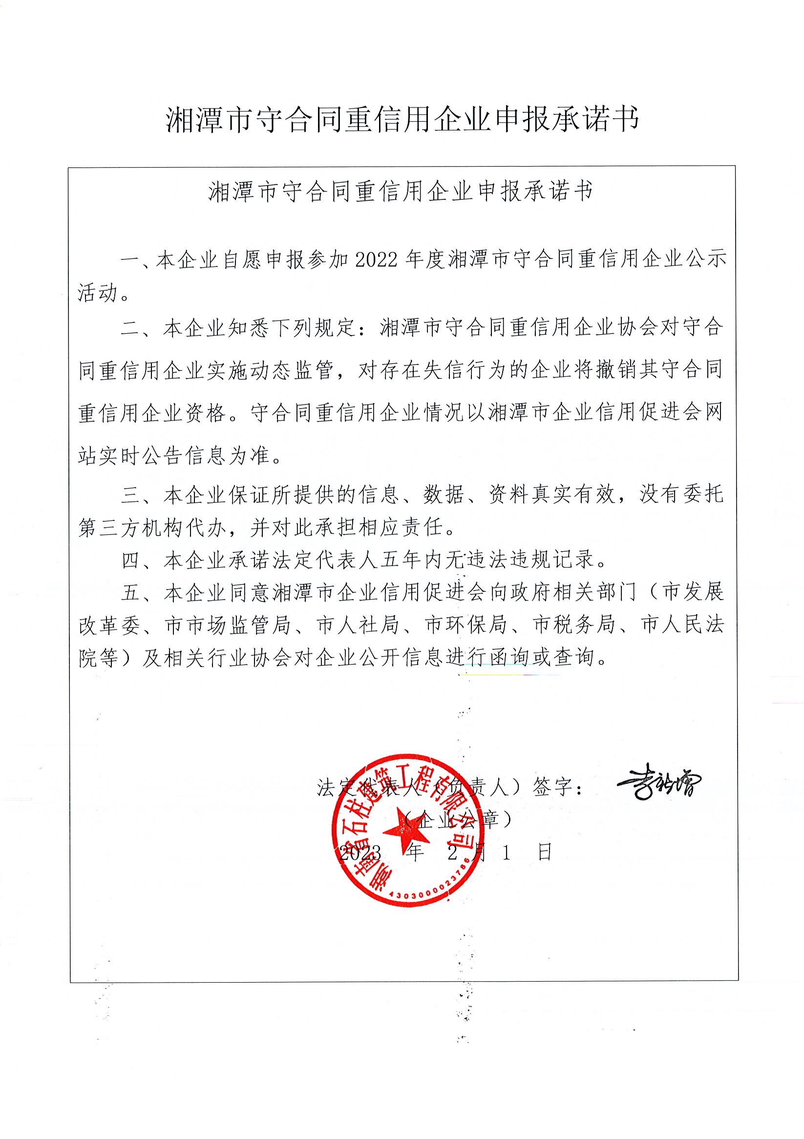 本企業(yè)根據(jù)《湘潭市守合同重信用企業(yè)申報規(guī)定》等編制 2022 年度企業(yè)信用報告書,并保證本報告書內(nèi)容真實、準(zhǔn)確、完整。