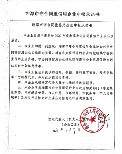 本企業(yè)根據(jù)《湘潭市守合同重信用企業(yè)申報規(guī)定》等編制 2022 年度企業(yè)信用報告書,并保證本報告書內(nèi)容真實、準(zhǔn)確、完整。