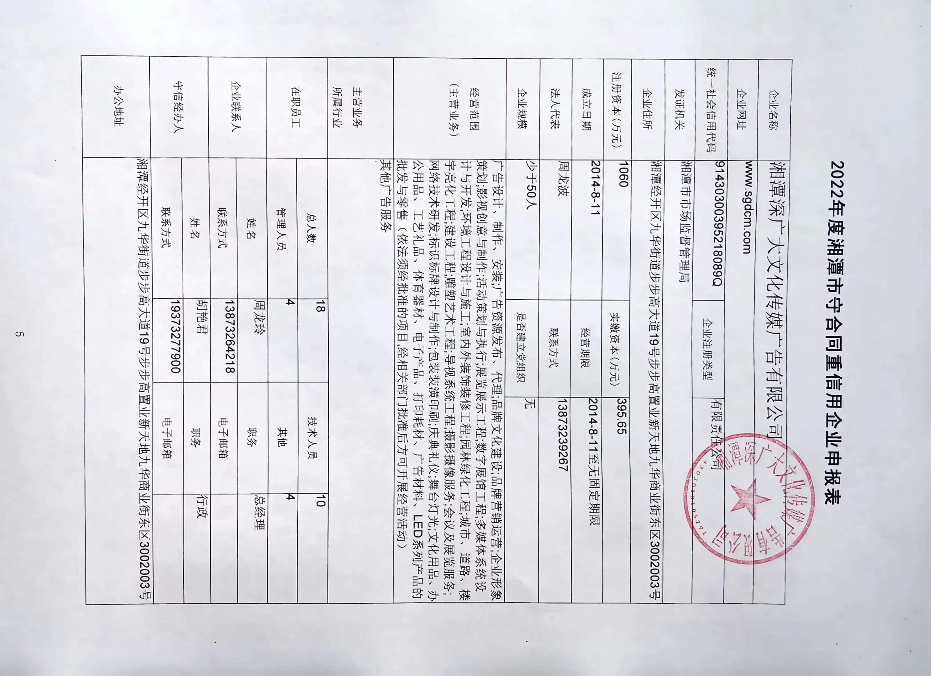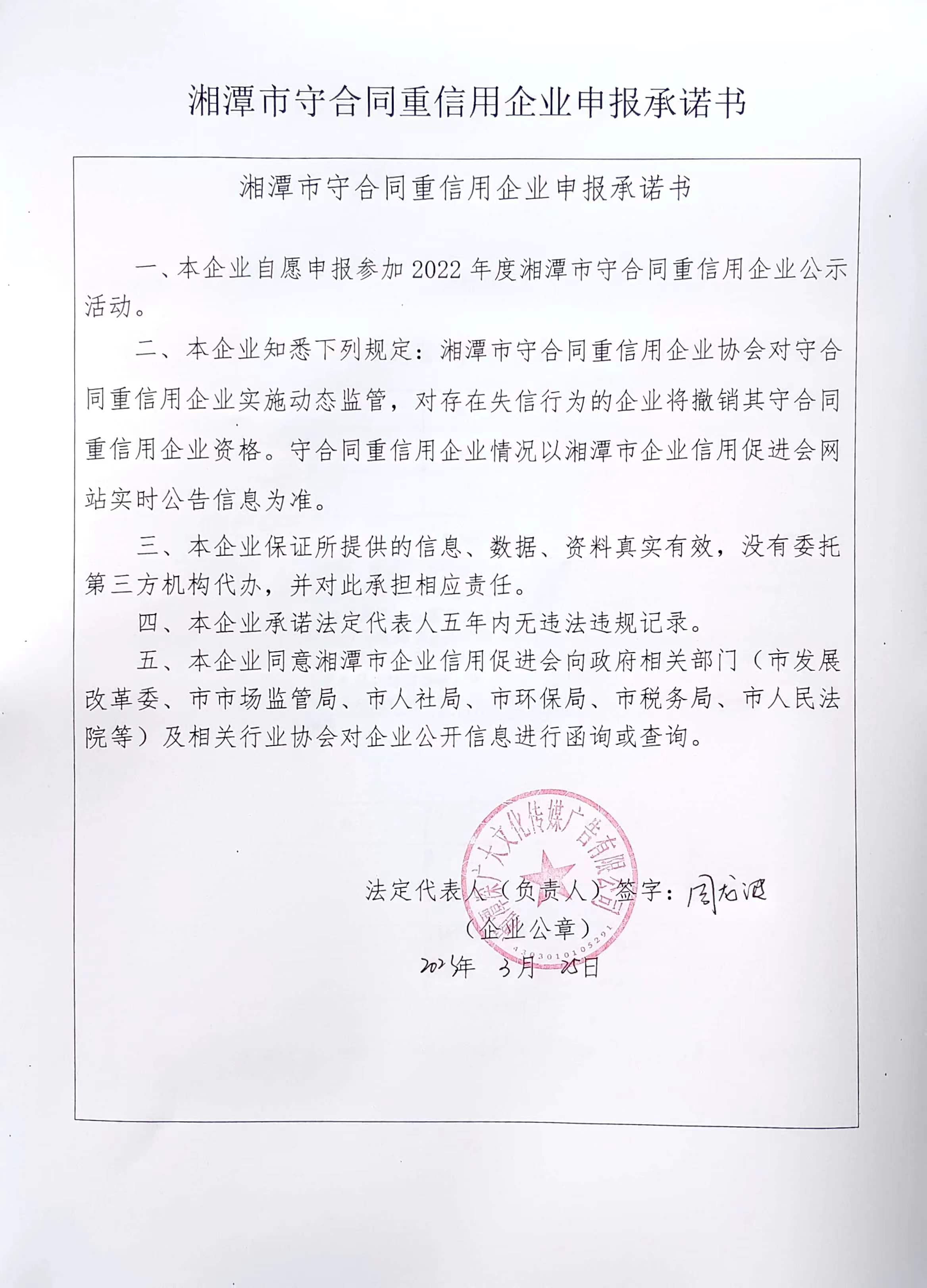 本企業(yè)根據(jù)《湘潭市守合同重信用企業(yè)申報規(guī)定》等編制 2022 年度企業(yè)信用報告書,并保證本報告書內(nèi)容真實、準(zhǔn)確、完整。