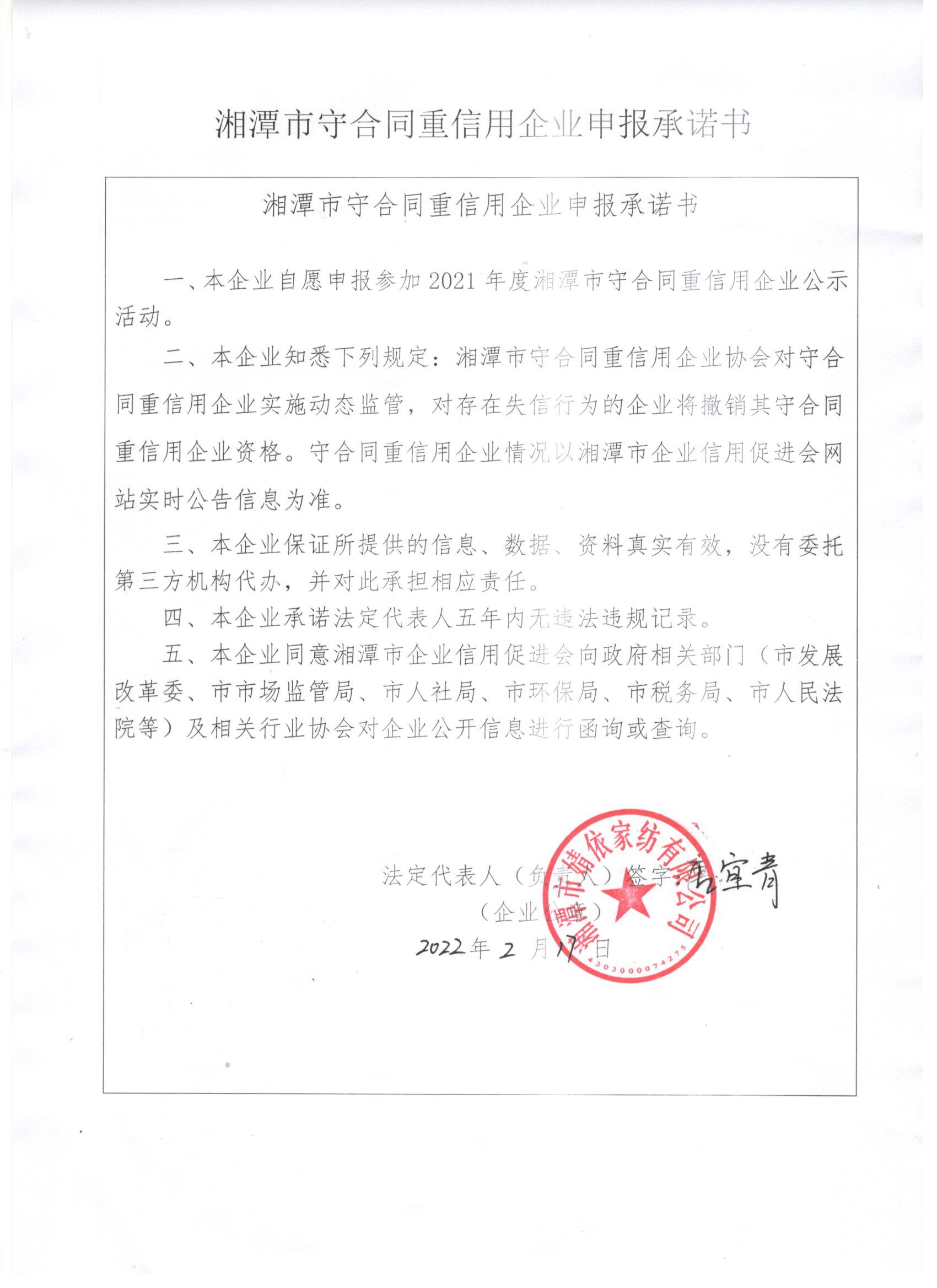 本企業(yè)根據(jù)《湘潭市守合同重信用企業(yè)申報(bào)規(guī)定》等編制 2021 年度企業(yè)信用報(bào)告書,并保證本報(bào)告書內(nèi)容真實(shí)、準(zhǔn)確、完整。