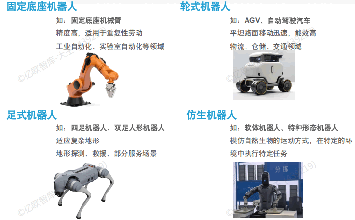 具身智能的物理載體形態(tài)豐富多樣,可以將其劃分為幾大類別:固定底座機(jī)器人、